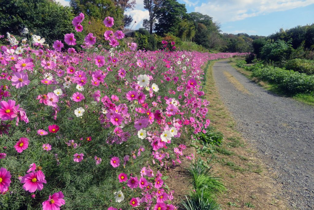 13:00、茅ヶ崎里山公園北駐車場に車を停め、活動を開始する。残念ながら富士山は雲間に隠れているが、コスモスが満開を迎え、前回以上に艶やかな色合いを見せている。この姿をパンフォーカスで撮影したところ、行き交った二人の女性の方と目が合い、『綺麗ですね!一番美しい時に撮影されて良かったですね‼』と仰ったので、「有難うございます。今が一番の見頃ですね‼」とお答えする。何れにせよ、満開のコスモス畑が数百メートル以上も続き、ここ茅ヶ崎では最大の規模と言えようか。この姿を様々なアングルで撮影したのち、芹沢の池に向かう。途中の湿地帯では、ヨギが銀色に輝き、ソーセージのようなガマの穂が弾けて綿毛を露出させている。