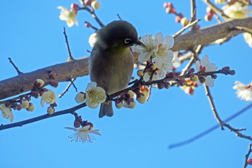 見晴らしの丘を登り始めると、河津桜の蕾が膨らみ、最初の一輪も確認できる。この姿を捉えたのち、元来た俣野公園に戻る。園内を巡ると、シジュウカラが芝生に落ちた緑の種を見つけ、相手に教えているようなシーンに出くわす。次に、これまで多くのメジロが寄ってきた白梅に向かうと、その姿はなく、そろそろ蜜を出さなくなったようなので、新たな白梅を探すと、狙い通り頻りに蜜を吸うメジロに出くわす。ただ動きが速く中々その姿を捉えにくいが、何とか数枚をものにする。この時期、”梅に鶯”ではなく”梅に目白”と言うところか。
