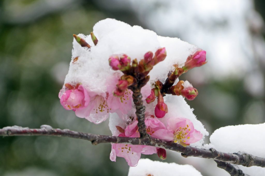 13:44、先ず咲き始めたカワズザクラをチェックすると、萼片に雪が積もり花弁も濡れて下を向いている。滅多に見られない光景だが、この状態では花蜜も薄まり、目白との出会いは期待薄である。次に、近くの紅梅ベニスズメを覗いてみると、花弁は垂れることなく横を向いており、小枝との間に積もった雪と美しいコントラストを見せており、今回のカバー写真にさせて頂く。ここから俣野公園に入ると、多目的広場全体が真っ白になっており、子供達の力作の雪だるまも何体か見られる。