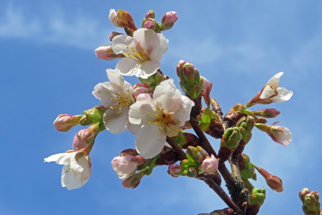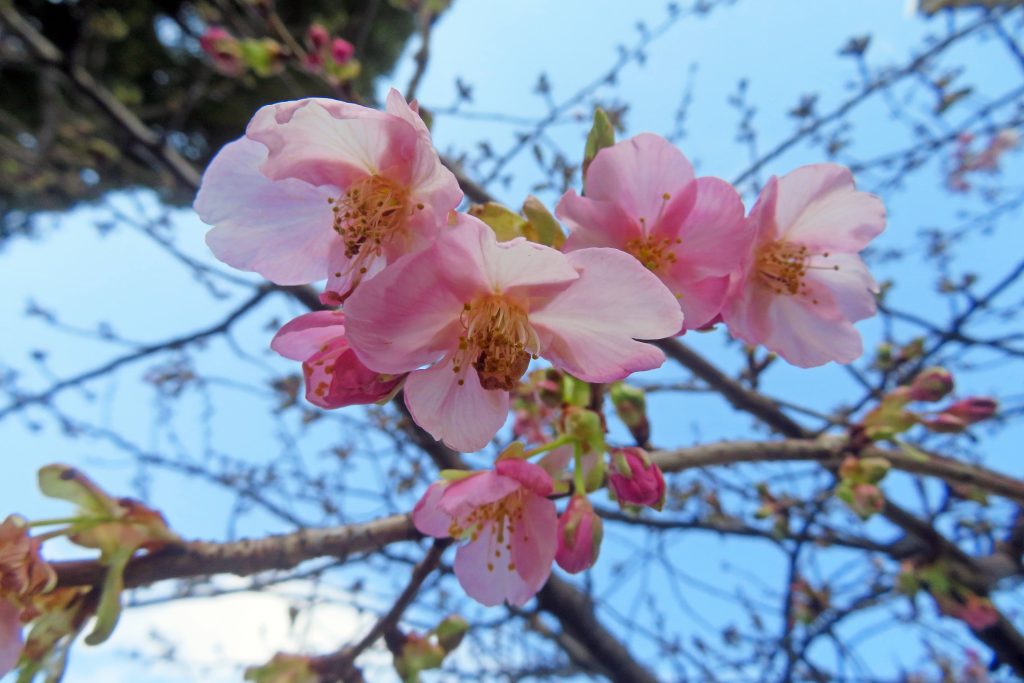 12:54、先ず咲き始めたカワズザクラを撮影したのち、紅梅ベニスズメに近付くと8分咲き程度となり、辺り一帯に濃厚な梅の香が漂っている。暫くするとヒヨドリが飛来したが、この姿に恐れをなしたのか、メジロは姿を見せない。俣野公園に入ると、濃赤色のカンヒザクラの蕾が膨らみ、最初の一輪も確認できる。近くには、早咲きのタマナワザクラ(ソメイヨシノ×オオカンザクラ)も二分咲き程度になっており、大船フラワーセンターで開発されたものが、この公園にも配布されたようである。池に近付くと、カワセミは確認できないものの、一昨日メジロを見かけたカワヅザクラの前で佇んでいると、狙い通りメジロが飛来する。この姿を捉えたのち霊園を通過すると、数羽のカワラヒワしか確認できなかったので、チョウゲンボウ他の野鳥に出会うため、天王森泉公園に下ることにする。