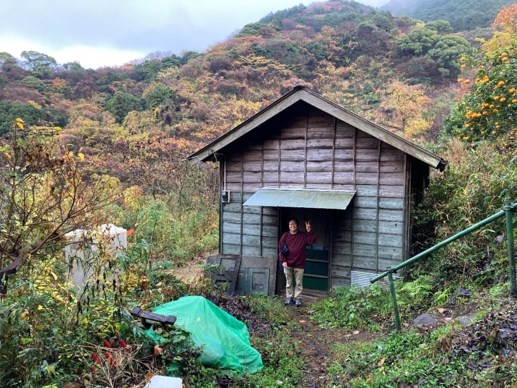 二日目の12月21日。朝、下りて行くと、ラクジーさんは「スンゴー行こう。さあこれ着て」と雨ガッパを僕に手渡し、自分はもう出発の準備を整えている。外はちょうど雨が止んだところだった。ひんやりした朝の空気が気持ち良い。スンゴーという場所には、ラクジーさんたちのかつてのみかん園や休憩小屋があるとは聞いていたが、どれだけ離れているのかも分からない。ともかくラクジーさんに導かれるまま、僕も井田の田舎道を急いだ。