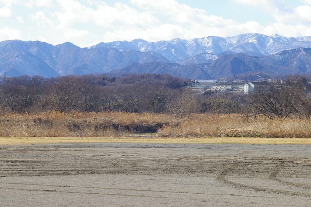 西の樹林帯に入ると、頭上から”コツコツ”と木を突く音が聞こえてくる。見上げると、コゲラが幹に穴を明け、中に潜む虫を取り出している最中である。この姿を捉えたのち、多目的広場に大回りして元来た駐車場に戻る。駐車場に到着すると、未だに富士山が姿を見せており、小出川沿いの遊歩道をウォーキングしつつ、この姿を捉えることにする。南西方向の地平線には、お椀を伏せたような山々が顔を出しており、最高峰の神山(標高1432m)と冠ヶ岳と言うところか。