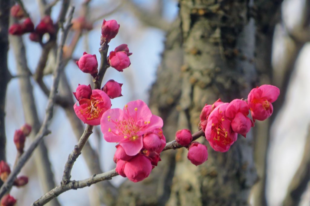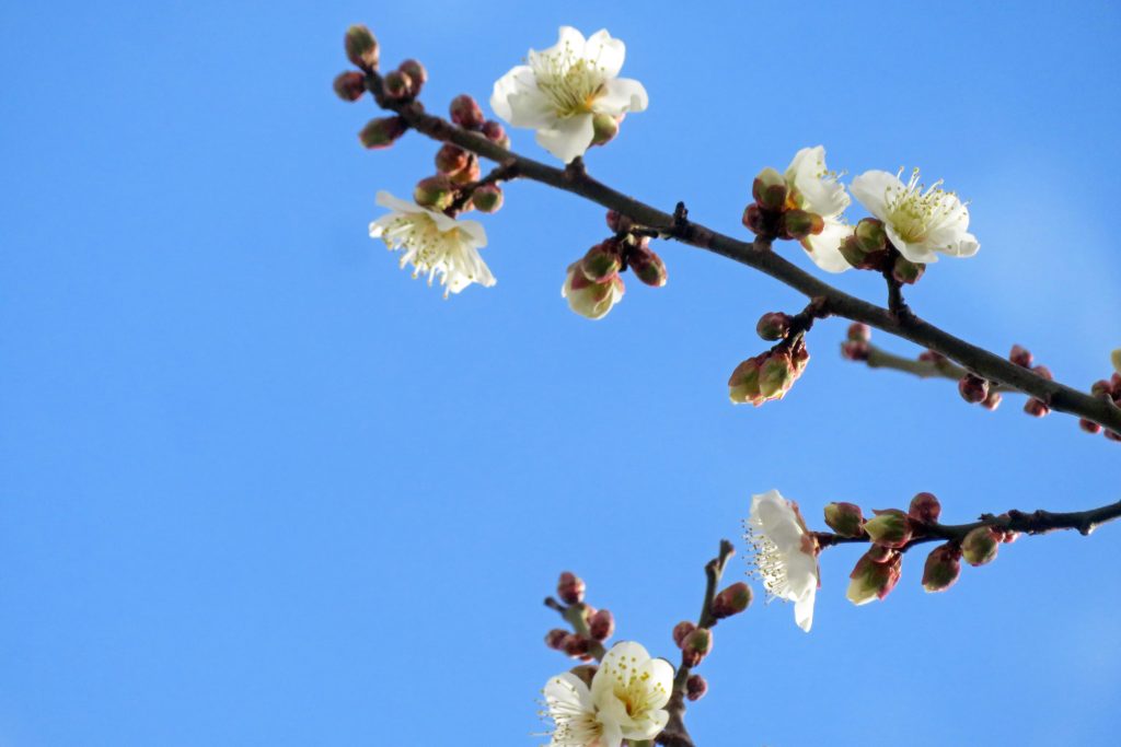 12:35、何時もの第二駐車場に車を停め、階段を上りピクニック広場に向かう。本日は正月休みの最終日とあって、寒空の中多くの家族連れが訪れている。だが、早咲きの八重寒紅は蕾が膨らんでいるものの、最初の一輪は確認できない。ドーナツ広場で艶やかなサザンカを撮影したのち梅林に向かうと、養生中とのことで立入禁止になっている。仕方がないので、奥の梅林に向かうと、八重の白梅(玉牡丹)が開花しており、この姿をズームアップして捉えることにする。