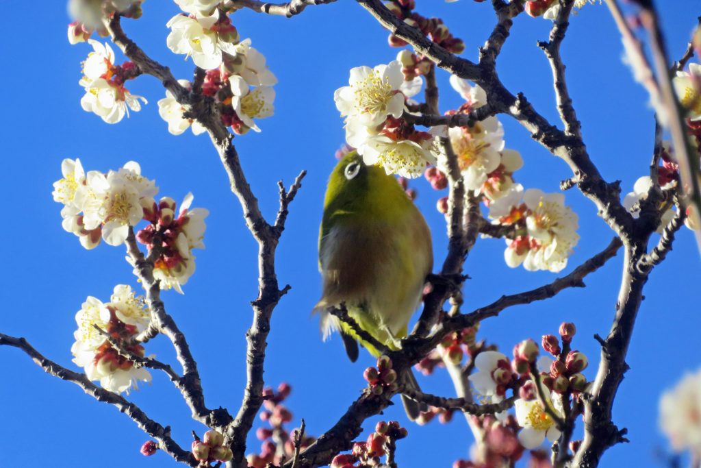 見晴らしの丘を登り始めると、河津桜の蕾が膨らみ、最初の一輪も確認できる。この姿を捉えたのち、元来た俣野公園に戻る。園内を巡ると、シジュウカラが芝生に落ちた緑の種を見つけ、相手に教えているようなシーンに出くわす。次に、これまで多くのメジロが寄ってきた白梅に向かうと、その姿はなく、そろそろ蜜を出さなくなったようなので、新たな白梅を探すと、狙い通り頻りに蜜を吸うメジロに出くわす。ただ動きが速く中々その姿を捉えにくいが、何とか数枚をものにする。この時期、”梅に鶯”ではなく”梅に目白”と言うところか。
