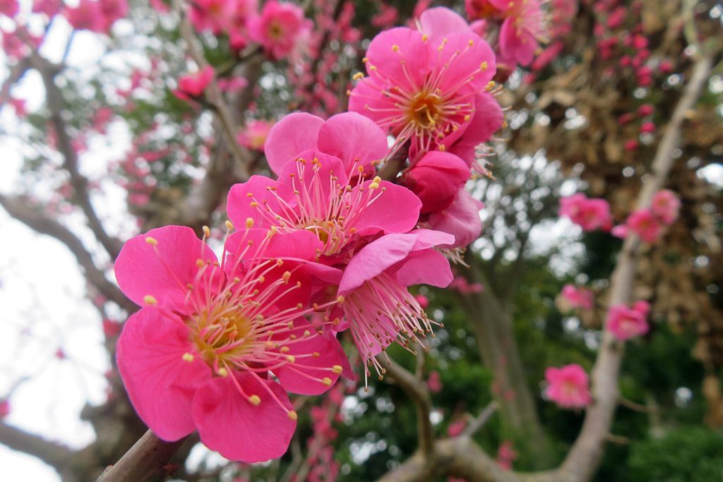 同公園の坂道を上って行くと、テニスコートの脇に小さな梅園が現れる。手前では白梅や枝垂れ梅が咲き始め、その奥では八重咲の紅梅”ヒノツカサ”が艶やかな姿を見せている。公園最上部の展望台に到着すると、やや霞んだ丹沢が一望できるものの、富士山は雲間に隠れてしまっている。西の空には哨戒機P-1が超低空で飛行しており、厚木基地に向けて着陸態勢に入ったところか。ここで活動量計チェックすると、既に7500歩を突破しており、ここから引き返えすことにする。